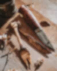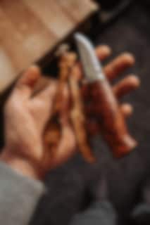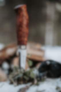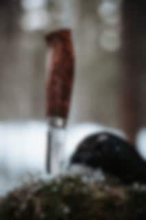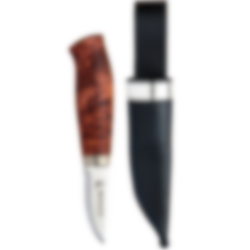 This is a small all-round knife, which is very good for small game hunting. Although the knife is small, it is a good knife for small game hunting and other tasks. The knife has a very good grip and fits both large and small hands. Sandvik in the blade makes it durable and easy to grind up. Engraved nickel silver band on top of the sheath. Oiled curly birch in the shaft. The knife is delivered with a sheath and a beautiful gift box.