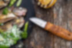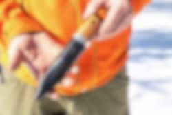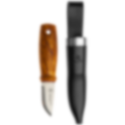 Ustaoset ist ein kleines Allround-Messer, das für fast alles verwendet werden kann. Dieses Messer hat eine kurze Messerklinge, die sich besonders gut eignet, wenn Sie volle Kontrolle über das Messer haben möchten. Die Klinge ist relativ hoch und gerade geschliffen, was eine schöne Kurve zur Messerspitze hin ergibt. Die Klingenstärke beträgt 2,2 mm, was ein solides Gefühl bei der Verwendung vermittelt. Der Griff ist aus geöltem Maserbirke hergestellt und verfügt über eine erhöhte Partie vor der Klinge, die einen guten Halt für kleine bis mittelgroße Hände bietet. Das Messer eignet sich besonders gut in Verbindung mit einem Feuerstahl aufgrund der kurzen und stabilen Klinge.