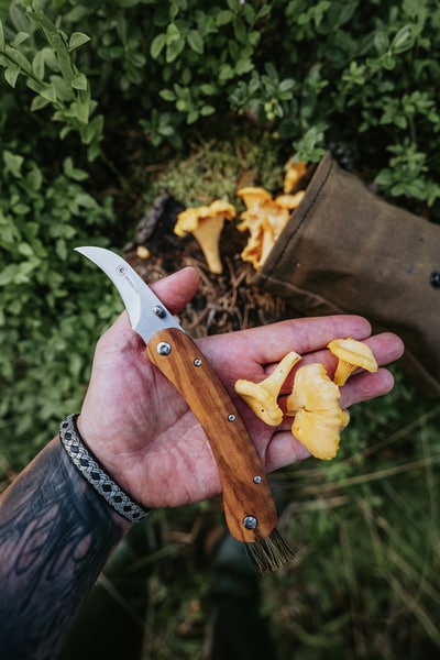 Das Vedalen-Pilzmesser ist ein funktionales und durchdachtes Werkzeug zum Pilzesammeln – ideal für Pfifferlinge und andere Speisepilze. Der Griff besteht aus robustem, geöltem Olivenholz und liegt auch bei feuchten Bedingungen sicher in der Hand. Am gegenüberliegenden Ende der Klinge befindet sich eine dichte und strapazierfähige Bürste aus echtem Wildschweinborsten, die Erde und Schmutz mühelos von frisch gesammelten Pilzen entfernt – ohne den Pilz selbst zu beschädigen.