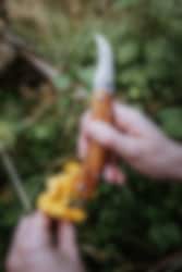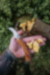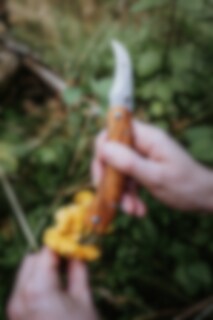 Die Klinge hat eine abgerundete Spitze, die das saubere Abschneiden des Pilzes nahe am Boden erleichtert, ohne dabei das Myzel zu beschädigen – das unterirdische Pilzgeflecht, das dafür sorgt, dass an derselben Stelle neue Pilze nachwachsen können.