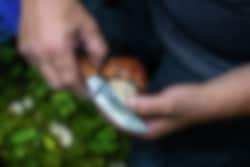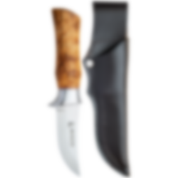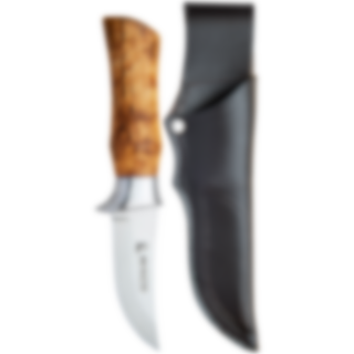 Dies ist ein sehr gutes Jagd-/Wandermesser mit einer hohl geschliffenen Messerklinge. Die Messerklinge hat eine geschwungene Trailing-Point-Spitze, die speziell für die Jagd entwickelt wurde, aber auch anderweitig einsetzbar ist. Da die Messerklinge hohl geschliffen ist, eignet sie sich perfekt zum Schneiden zwischen Haut und Fleisch. Die Messerklinge ist nicht zu lang, was die Handhabung des Messers erleichtert. Das Messer hat einen gegossenen Aluminiumgriff mit Fingerschutz. Sandvik-Stahl in der Messerklinge, der besonders haltbar ist und geölte Maserbirke im Griff. Das Messer hat eine Fassung aus gegossenem Aluminium. Es wird mit einer Lederscheide und in einer schönen Geschenkbox geliefert.