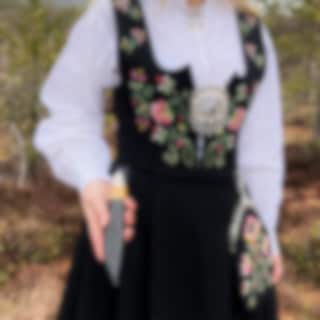 Bunadsmesser sind für Damen und Herren! Am Herrenbunad wird das Bunadsmesser mit einem Silberknopf befestigt, während es am Damenbunad entweder am Silbergürtel, mit einem Silberknopf oder durch eine kleine Schlaufe im Rock befestigt wird, in die die Scheide gesteckt wird.
